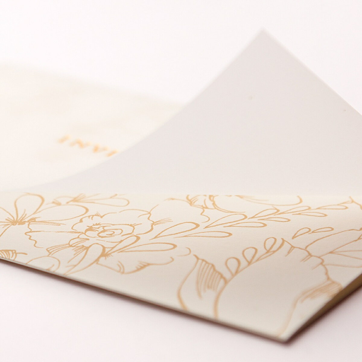 『INVITATION』の文字は箔押しになっていて、うっすらとやさしく 透ける花々の中央で存在感を持って輝いています。